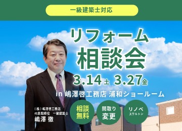【実物を見て、触れて、相談できる!無料リフォーム相談会 in 嶋澤啓工務店 浦和ショールーム】 「理想の住まい」をカタチにする第一歩を、浦和ショールームで始めませんか? 2023年5月にニューオープンした嶋澤啓工務店の浦和ショールームでは、最新の住宅設備商品を全12台展示!実際に見て、触れて、体感しながら、あなたのリフォームのイメージを膨らませることができます。 さらに、建築業界経験41年のベテラン【一級建築士】が、あなたの疑問や不安に無料でお答えいたします。 「間取りを大きく変えたいけど、何から始めればいいの?」 「最新の水廻り設備って、どんなものがあるの?」 そんな疑問も、長年の経験と専門知識を持つ一級建築士が、親身になってアドバイスいたします。図面をお持ちいただければ、具体的なプランニングのご相談も可能です。 開催日時・場所について 開催日時(完全予約制) 3月14日(土) 13時~17時 3月27日(金) 13時~17時 各日 2組様限定、お一人様 1時間 の個別相談ですので、じっくりと悩みをお聞かせください。 完全予約制となっておりますので、5日前までにお申込みください。 浦和ショールーム所在地: 〒336-0022 埼玉県さいたま市南区白幡4-14-24 --------------------------------------------------------------------------------- リフォームはまだ先…という方も大歓迎! 最新の設備を見るだけでも、今後の住まいづくりのヒントが見つかるかもしれません。お気軽にお越しください。 まずは浦和ショールームへ!無料リフォーム相談会のお申込みはこちらから▼
