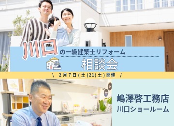 【無料相談会】中古住宅リノベ相談会 一級建築士がお悩みを解決 平素より、株式会社嶋澤啓工務店のウェブサイトをご利用いただき、誠にありがとうございます。 2024年3月にリニューアルオープンした川口ショールームには、おかげさまで多くのお客様にご来場いただいております。 一級建築士対応 中古住宅リノベ相談会を開催いたします。 中古住宅リノベ以外にもリフォームを検討されている方、住まいのお悩みをお持ちの方に、最適な解決策をご提案いたします。 │中古住宅リノベ相談会の概要 会場: 嶋澤啓工務店 川口ショールーム 日程:1日限定 2026年1月24日(土) 10:00~12:00 / 13:00~17:00 ※ご希望のお時間までご指定ください ※ご予約状況によりご希望に添えない場合がございます。ご予約フォーム送信後、お電話またはメールにて改めてご案内させていただきます。 │この相談会の3つのメリット 1. リニューアルした川口ショールームで理想の空間を体感 生まれ変わった川口ショールームでは、最新の水回り設備を多数常設展示しております。キッチン、お風呂、洗面台、トイレなど、実物に触れてその機能性やデザインをご確認いただけます。 特にこだわったのは、キッチンとダイニングの空間展示です。 ナチュラル、北欧、インダストリアル、シックの4つの異なるテイストの空間を再現し、内装やインテリアとの調和を体感いただけます。 フローリングや内装材なども実物をご覧いただけるため、リフォーム後のイメージが格段に掴みやすくなります。 理想の住まいを具体的に描くためのヒントが満載です。 2. 一級建築士が直接お家の悩みを無料で解決 「どこから手をつけていいか分からない」 「予算内で理想のリフォームは可能?」 など、住まいに関する疑問や不安は尽きないものです。 当日は、川口ショールームに在籍する一級建築士が、お客様のお困り事を無料で直接お伺いいたします。 中古住宅リノベや水回りのご相談はもちろんのこと、以下のような幅広いお悩みにも対応可能です。 ◇ライフスタイルの変化に伴う間取り変更 ◇二世帯住宅へのリフォーム検討 ◇その他お住まいに関するあらゆるご相談 気になる中古物件の間取り図やご自宅の図面・お写真をお持ちいただければ、より具体的なリフォームプランや概算費用をお伝えできますので、ぜひご持参ください。 3. 来場予約で嬉しいQUOカードPayプレゼント! 事前にWEBサイトからご来場予約をいただいたお客様には、感謝の気持ちを込めてQUOカードPay1,000円分をプレゼントいたします。 ※既に弊社にお問い合わせ済みのお客様、お電話でのご予約は対象外となりますので、予めご了承ください。 嶋澤啓工務店 川口ショールームで、リフォームの第一歩を踏み出しませんか? 経験豊富なスタッフと一級建築士が、皆様の理想の住まいづくりを全力でサポートいたします。 皆様のお越しをスタッフ一同心よりお待ちしております。 イベント予約はこちらから ▼
