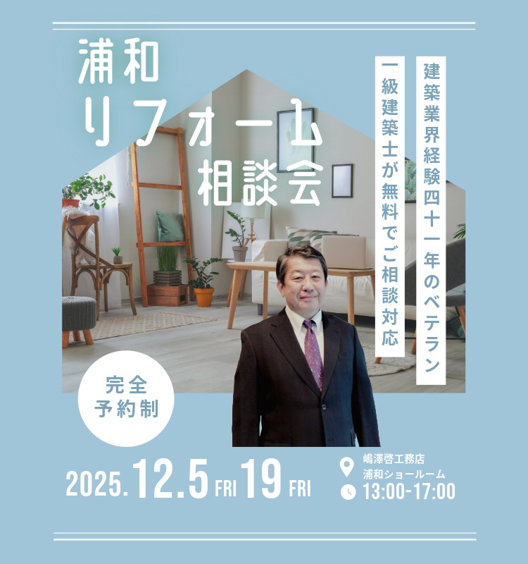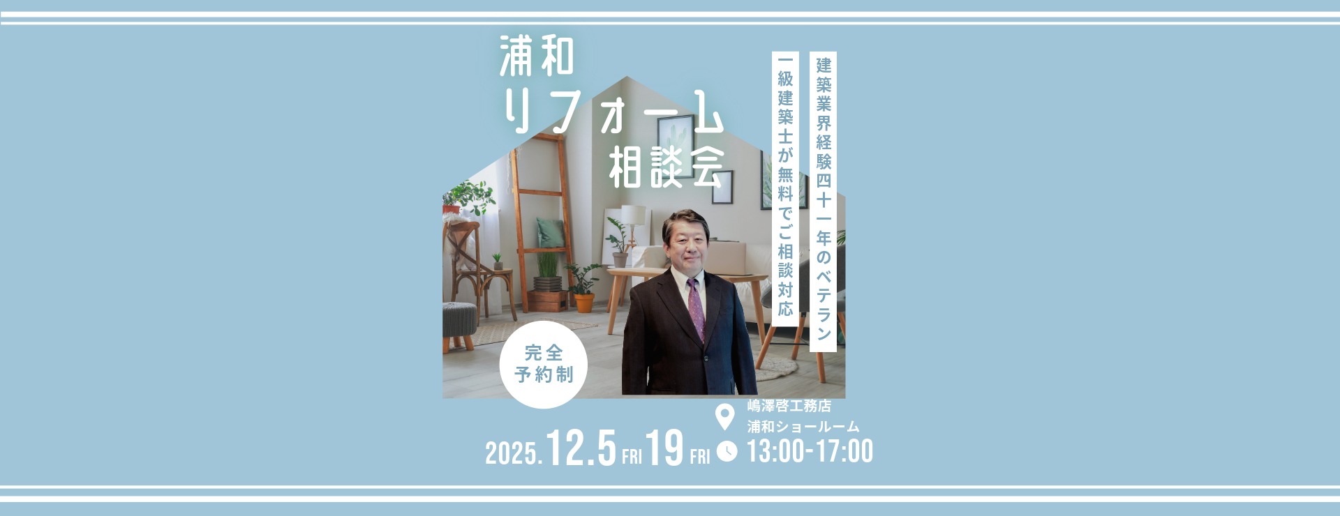 【実物を見て、触れて、相談できる!無料リフォーム相談会 in 嶋澤啓工務店 浦和ショールーム】 「理想の住まい」をカタチにする第一歩を、浦和ショールームで始めませんか? 2023年5月にニューオープンした嶋澤啓工務店の浦和ショールームでは、最新の住宅設備商品を全12台展示!実際に見て、触れて、体感しながら、あなたのリフォームのイメージを膨らませることができます。 さらに、建築業界経験41年のベテラン【一級建築士】が、あなたの疑問や不安に無料でお答えするリフォーム相談会を開催いたします。 「間取りを大きく変えたいけど、何から始めればいいの?」 「最新の水廻り設備って、どんなものがあるの?」 そんな疑問も、長年の経験と専門知識を持つ一級建築士が、親身になってアドバイスいたします。図面をお持ちいただければ、具体的なプランニングのご相談も可能です。 開催日時・場所について 開催日時(完全予約制) 12月5日(金) 13時~17時 12月19日(金) 13時~17時 各日 2組様限定、お一人様 1時間 の個別相談ですので、じっくりと悩みをお聞かせください。 完全予約制となっておりますので、お早めにお申込みください。 浦和ショールーム所在地: 〒336-0022 埼玉県さいたま市南区白幡4-14-24 --------------------------------------------------------------------------------- リフォームはまだ先…という方も大歓迎! 最新の設備を見るだけでも、今後の住まいづくりのヒントが見つかるかもしれません。お気軽にお越しください。 まずは浦和ショールームへ!無料リフォーム相談会のお申込みはこちらから▼
