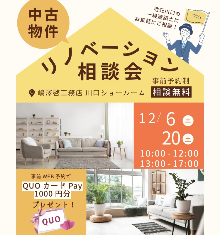 【無料相談会】中古住宅リノベ相談会 一級建築士がお悩みを解決 平素より、株式会社嶋澤啓工務店のウェブサイトをご利用いただき、誠にありがとうございます。 2024年3月にリニューアルオープンした川口ショールームには、おかげさまで多くのお客様にご来場いただいております。 一級建築士対応 中古住宅リノベ相談会を開催いたします。 中古住宅リノベ以外にもリフォームを検討されている方、住まいのお悩みをお持ちの方に、最適な解決策をご提案いたします。 │中古住宅リノベ相談会の概要 会場: 嶋澤啓工務店 川口ショールーム 日程:2日間限定 2025年12月6日(土) 10:00~12:00 / 13:00~17:00 2025年12月20日(土) 10:00~12:00 / 13:00~17:00 ※ご希望のお時間までご指定いただけます。 ※ご予約状況によりご希望に添えない場合がございます。ご予約フォーム送信後、お電話またはメールにて改めてご案内させていただきます。 │この相談会の3つのメリット 1. リニューアルした川口ショールームで理想の空間を体感 生まれ変わった川口ショールームでは、最新の水回り設備を多数常設展示しております。キッチン、お風呂、洗面台、トイレなど、実物に触れてその機能性やデザインをご確認いただけます。 特にこだわったのは、キッチンとダイニングの空間展示です。 ナチュラル、北欧、インダストリアル、シックの4つの異なるテイストの空間を再現し、内装やインテリアとの調和を体感いただけます。 フローリングや内装材なども実物をご覧いただけるため、リフォーム後のイメージが格段に掴みやすくなります。 理想の住まいを具体的に描くためのヒントが満載です。 2. 一級建築士が直接お家の悩みを無料で解決 「どこから手をつけていいか分からない」 「予算内で理想のリフォームは可能?」 など、住まいに関する疑問や不安は尽きないものです。 当日は、川口ショールームに在籍する一級建築士が、お客様のお困り事を無料で直接お伺いいたします。 中古住宅リノベや水回りのご相談はもちろんのこと、以下のような幅広いお悩みにも対応可能です。 ◇ライフスタイルの変化に伴う間取り変更 ◇二世帯住宅へのリフォーム検討 ◇その他お住まいに関するあらゆるご相談 気になる中古物件の間取り図やご自宅の図面・お写真をお持ちいただければ、より具体的なリフォームプランや概算費用をお伝えできますので、ぜひご持参ください。 3. 来場予約で嬉しいQUOカードPayプレゼント! 事前にWEBサイトからご来場予約をいただいたお客様には、感謝の気持ちを込めてQUOカードPay1,000円分をプレゼントいたします。 ※既に弊社にお問い合わせ済みのお客様、お電話でのご予約は対象外となりますので、予めご了承ください。 嶋澤啓工務店 川口ショールームで、リフォームの第一歩を踏み出しませんか? 経験豊富なスタッフと一級建築士が、皆様の理想の住まいづくりを全力でサポートいたします。 皆様のお越しをスタッフ一同心よりお待ちしております。 イベント予約はこちらから ▼