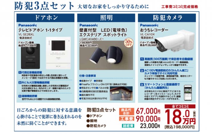通常、個別に商品を購入し業者に依頼するよりも、「ドアホン・照明・防犯カメラ」の3点をセットにし、商品代・工事費・諸経費の全てを込みにした18.0万円(税別)という特別価格でご提供します。