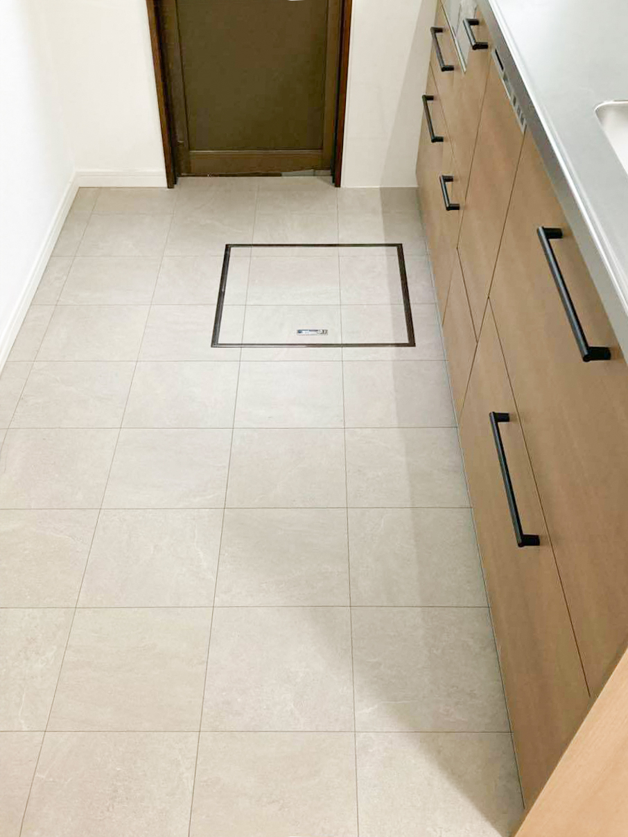 フローリングの上にフロアタイルを施工することで、リビングとの段差をほぼ生じさせることなく、水や油に強いキッチン専用の床が実現しました。水ハネや油汚れもサッと一拭きで済むため、「日々の掃除のストレスがなくなった」と大変ご好評いただいております。