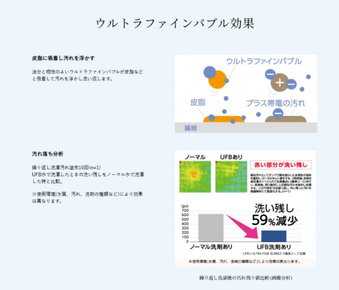 汚れを吸着して除去: 泡が汚れを吸着して洗い流すため、皮脂汚れや砂・泥汚れなど、従来の洗濯では落ちにくかった汚れ残りを大幅に減少させる効果が期待できます。