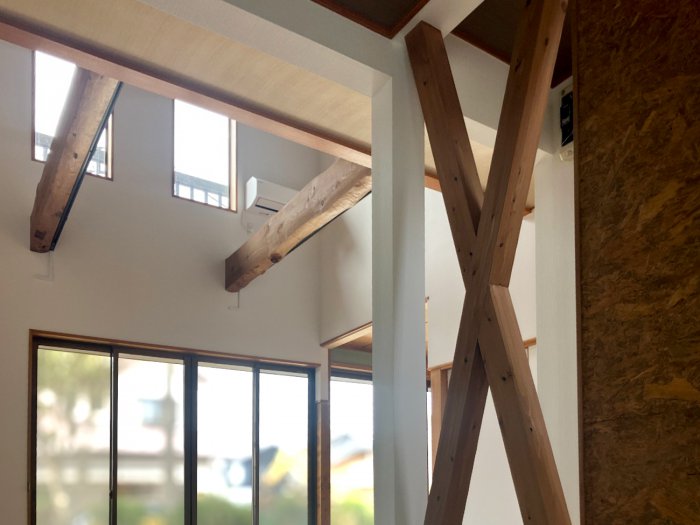 天井を吹き抜けにし、あえて力強い「太鼓梁」を新たに取り付けることで、