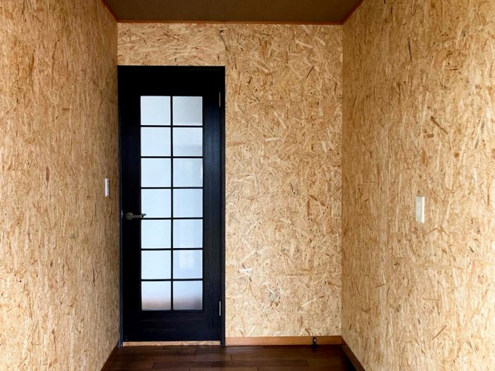 玄関の壁には、ラフな質感がかっこいいOSB合板を大胆に使用。