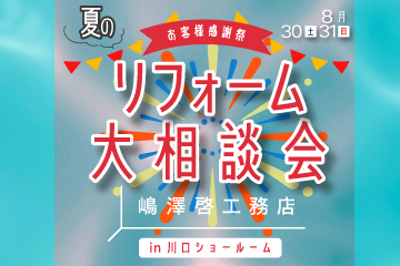 平素より嶋澤啓工務店のホームページをご閲覧・ご利用頂き 誠にありがとうございます。 川口ショールーム夏のリフォーム大相談会 イベントのご案内です! イベント詳細はこちら ♦来場特典・見積特典など多数ご用意! ●川口店だけ!キッチンカー来場します! イベントご予約の方、当日お見積りご依頼をいただいた方、ご家族全員選べて楽しいひんやりスイーツ&いもフライもれなくプレゼント! ●TOTO・LIXIL・タカラスタンダードの営業スタッフ様ご参加 その場で商品の詳しいご案内が受けられるチャンスです! プランのご提案も承ります! ・8/30(土)終日…LIXIL・タカラスタンダード営業スタッフ ・8/31(日)終日…TOTO営業スタッフ 上記日程でイベントにご参加してくださっています。お気軽にお声がけください! ①来場特典…ガラガラ抽選会★ ハズレなし、もらえてうれしい景品どどーんとご用意! 一組様につき、1回までのチャレンジです。 一等は人気のSHARPサーキュレーター。ディープカラーでお部屋に馴染みます。本体カラーが白くないので経年劣化による黄ばみが目立ちません!洗濯物も乾きます。 三等はエビスビール飲み比べセット! ②来場特典…サイコロチャレンジ★ サイコロの目の分だけカップスープお持ち帰り頂けます。 一組様につき、1回までのチャレンジです。 ③ダブル見積特典…選べて嬉しいtower他キッチングッズご進呈&キッチンカーのスイーツご家族全員プレゼント イベントご来場時にお見積り依頼をくださったお客様にもれなくお渡しいたします。 ④契約特典…2万円選べるカタログギフトご進呈 100万円(税別)以上ご契約いただいた方 イベント会場はこちら ********************* 予約空き現在情報詳細 ********************* 混雑する時間帯が発生する場合 こちらに掲載させていただきます。 ♦イベント開催日程 2025年8月30日(土)31(日)の2日間開催 10:00~17:00迄 ♦開催会場 嶋澤啓工務店川口ショールーム 埼玉県川口市末広2-4-6 ♦来場特典・見積特典など多数ご用意! 事前のご来場予約をお勧めしております。 当ホームページにてご来場予約を頂けますと (こちらのページ下部に申し込みフォームあり) QUOカードPay1,000円ご進呈致しますのお得です!! こんな工事が得意です 嶋澤啓工務店は元々大工で創業した会社。 例えば同じリフォーム会社でも 水廻りの交換は得意でも 大工工事が絡むとできないとお断りされたお客様… ぜひ一度弊社にご相談ください! 嶋澤啓工務店はむしろ水廻り単品工事よりも 水廻り工事にプラスして、壁紙の貼替えや配管の取替えや間取り変更などの複合工事が得意なリフォーム会社。 だから内装、大工さんが必要な工事でもご依頼OKです。 今現在はトイレやお風呂の交換のみの工事しか検討していないけど 将来的には中規模~大規模な リフォームご検討中のお客様も ご遠慮なくご相談ください。 今後のお家のお困り時の為に 是非早いうちからお付き合いさせていただければと思います。 生まれ変わった川口ショールーム 2024年にリニューアルした川口ショールームは 4つの空間展示をご用意し よりリフォームをイメージしやすい展示へ 大幅チェンジしました。 ご来場になったお客様からは 「広~い!」「素敵~!」「外から見る感じと違うね」と、 いつも驚きとお褒めのお言葉を頂戴しております。 内装やインテリアを含めてで空間を検討しやすいショールームへ 生まれ変わりましたので是非水廻りの交換ついでに お部屋をリフレッシュするきっかけ作りとして お気軽にお越しくださいませ。 生まれ変わった川口ショールームで 皆様のご来場を心よりお待ちしております。 ご来場予約フォームはこちらから▼