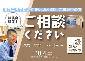 【無料相談会】リニューアルした川口ショールームで理想のリフォームを叶える!一級建築士がお悩みを解決 平素より、株式会社嶋澤啓工務店のウェブサイトをご利用いただき、誠にありがとうございます。 2024年3月にリニューアルオープンした川口ショールームには、おかげさまで多くのお客様にご来場いただいております。 皆様からの熱いご要望にお応えし、この度、「ショールーム空間展示見学会」と「一級建築士による無料お悩み相談」を兼ね備えた、事前予約制の限定来場枠をご用意いたしました。 リフォームを検討されている方、住まいのお悩みをお持ちの方に、最適な解決策をご提案いたします。 │川口リフォーム相談会の概要 会場: 嶋澤啓工務店 川口ショールーム 日程:1日限定 2025年10月4日(土) 10:00~12:00 / 13:00~17:00 ※ご希望のお時間までご指定いただけます。 ※ご予約状況によりご希望に添えない場合がございます。ご予約フォーム送信後、お電話またはメールにて改めてご案内させていただきます。 │この相談会の3つのメリット 1. リニューアルした川口ショールームで理想の空間を体感 生まれ変わった川口ショールームでは、最新の水回り設備を多数常設展示しております。キッチン、お風呂、洗面台、トイレなど、実物に触れてその機能性やデザインをご確認いただけます。 特にこだわったのは、キッチンとダイニングの空間展示です。 ナチュラル、北欧、インダストリアル、シックの4つの異なるテイストの空間を再現し、内装やインテリアとの調和を体感いただけます。 フローリングや内装材なども実物をご覧いただけるため、リフォーム後のイメージが格段に掴みやすくなります。 理想の住まいを具体的に描くためのヒントが満載です。 2. 一級建築士が直接お家の悩みを無料で解決 「どこから手をつけていいか分からない」 「予算内で理想のリフォームは可能?」 など、住まいに関する疑問や不安は尽きないものです。 当日は、川口ショールームに在籍する一級建築士が、お客様のお困り事を無料で直接お伺いいたします。 水回りのご相談はもちろんのこと、以下のような幅広いお悩みにも対応可能です。 ◇ライフスタイルの変化に伴う間取り変更 ◇二世帯住宅へのリフォーム検討 ◇中古物件購入後のリノベーション ◇その他お住まいに関するあらゆるご相談 気になる中古物件の間取り図やご自宅の図面・お写真をお持ちいただければ、より具体的なリフォームプランや概算費用をお伝えできますので、ぜひご持参ください。 3. 来場予約で嬉しいQUOカードPayプレゼント! 事前にWEBサイトからご来場予約をいただいたお客様には、感謝の気持ちを込めてQUOカードPay1,000円分をプレゼントいたします。 ※既に弊社にお問い合わせ済みのお客様、お電話でのご予約は対象外となりますので、予めご了承ください。 嶋澤啓工務店 川口ショールームで、リフォームの第一歩を踏み出しませんか? 経験豊富なスタッフと一級建築士が、皆様の理想の住まいづくりを全力でサポートいたします。 皆様のお越しをスタッフ一同心よりお待ちしております。 イベント予約はこちらから ▼
