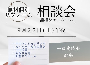 【実物を見て、触れて、相談できる!無料リフォーム相談会 in 嶋澤啓工務店 浦和ショールーム】 「理想の住まい」をカタチにする第一歩を、浦和ショールームで始めませんか? 2023年5月にニューオープンした嶋澤啓工務店の浦和ショールームでは、最新の住宅設備商品を全12台展示!実際に見て、触れて、体感しながら、あなたのリフォームのイメージを膨らませることができます。 さらに、建築業界経験41年のベテラン【一級建築士】が、あなたの疑問や不安に無料でお答えするリフォーム相談会を開催いたします。 「間取りを大きく変えたいけど、何から始めればいいの?」 「最新の水廻り設備って、どんなものがあるの?」 そんな疑問も、長年の経験と専門知識を持つ一級建築士が、親身になってアドバイスいたします。図面をお持ちいただければ、具体的なプランニングのご相談も可能です。 開催日時・場所について 開催日時(完全予約制) 9月27日(土) 13時~17時 各日 2組様限定、お一人様 1時間 の個別相談ですので、じっくりと悩みをお聞かせください。 完全予約制となっておりますので、ご希望日の5日前までにお早めにお申込みください。 浦和ショールーム所在地: 〒336-0022 埼玉県さいたま市南区白幡4-14-24 --------------------------------------------------------------------------------- リフォームはまだ先…という方も大歓迎! 最新の設備を見るだけでも、今後の住まいづくりのヒントが見つかるかもしれません。お気軽にお越しください。 まずは浦和ショールームへ!無料リフォーム相談会のお申込みはこちらから▼