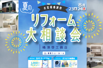 平素より嶋澤啓工務店のホームページをご閲覧・ご利用頂き誠にありがとうございます。 2025浦和ショールーム夏のリフォーム大相談会のご案内です。 イベントではお気軽にご自宅のお悩み御聞かせください。 プロのリフォームアドバイザーと有名メーカー営業スタッフ様がご来場のご対応をさせて頂きます! ♦イベント開催日程 2025年8月23日(土)24(日)の2日間開催 10:00~17:00迄 ♦開催会場 嶋澤啓工務店浦和ショールーム ♦来場特典・見積特典など多数ご用意! ①来場特典…ガラガラ抽選会★ ハズレなし、もらえてうれしい景品どどーんとご用意! 一組様につき、1回までのチャレンジです。 一等は人気のSHARPサーキュレーター。ディープカラーでお部屋に馴染みます。本体カラーが白ではないので経年劣化による黄ばみが目立ちません!洗濯物も乾かせる優れモノ。 三等はエビスビール飲み比べセット!お家で楽しんでください! ②来場特典…サイコロチャレンジ★ サイコロの目の分だけカップスープお持ち帰り頂けます。 一組様につき、1回までのチャレンジです。 ③見積特典…選べて嬉しいtower他キッチングッズご進呈 イベントご来場時にお見積り依頼をくださったお客様に もれなくお渡しいたします。 ④契約特典…2万円選べるカタログギフトご進呈 100万円(税別)以上ご契約いただいた方 浦和ショールーム内観写真 事前のご来場予約がオススメです。 当ページにてご来場予約を頂けますと QUOカードPay1,000円分ご進呈致しますのお得です!! ご来場ご予約希望のお客様は ページ下部まで下りていただき イベント申し込みフォームまで!! ~ご来場方法アクセス~ ★お車でお越しの場合… ショールーム前にいるスタッフが駐車場のご案内をいたします ★電車+徒歩でお越しの場合... 最寄りJR武蔵浦和駅で降車頂き 徒歩10~15分です。 ~浦和ショールーム情報~ 浦和ショールームは2023年にグランドオープン致しました。 国道17号沿いの本社ビルに隣接の水廻り商品常設ショールームとなっております。 [展示品内訳]★計12台★ ●キッチン…4台 ●浴室…3台 ●洗面台…2台 ●トイレ…4台 弊社は工務店なので LDK改修や二世帯住宅へ改修、 お子様が巣立った後の間取り変更改修、 中古物件購入フルリフォームのような 中~大型改修も得意分野です。 もしリフォームのご相談でご来場いただける際は 図面もご持参頂けますとお話しがよりスムーズになります。 イベントご予約空き状況 ■8/23(土) 10:00 - × 11:00 - 残りわずか 12:00 - ◎ 13:00 - 残りわずか 14:00 - 残りわずか 15:00 - 残りわずか 16:00 - ◎ ------------------------ ■8/24(日) 10:00 - × 11:00 - 残りわずか 12:00 - ◎ 13:00 - ◎ 14:00 - ◎ 15:00 - ◎ 16:00 - 残りわずか 皆様のご来場を心よりお待ちしております。