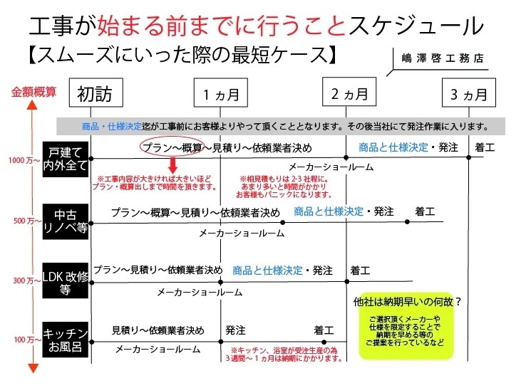 リフォームは商品の発注から納品まで平均1ヶ月かかるなど、実は時間の確保が成功の鍵。 新生活を新しいお家で迎えたいというご希望に合わせ、プロの視点からお客様専用の逆算スケジュールをご提示いたします。