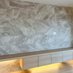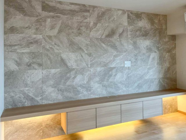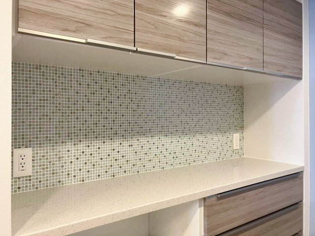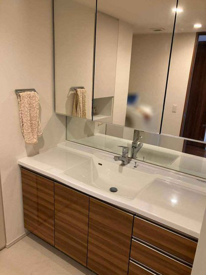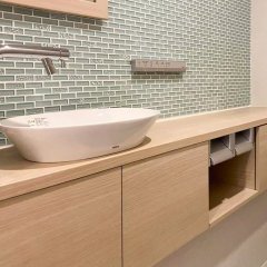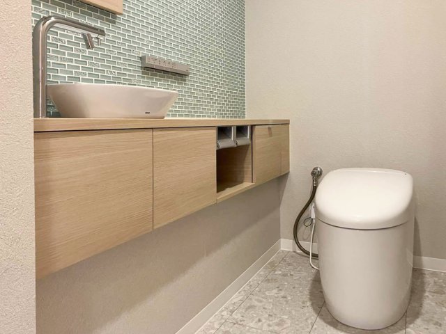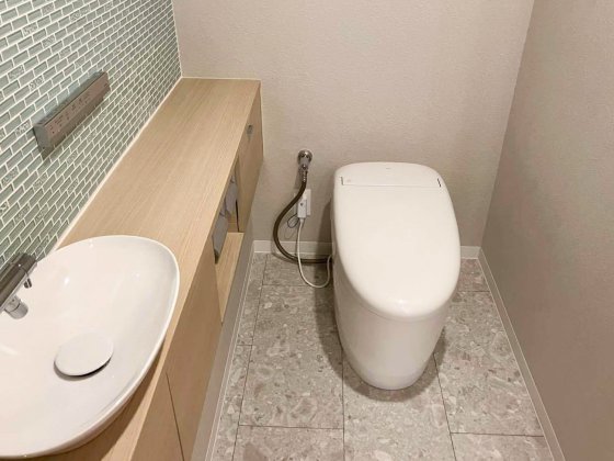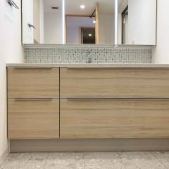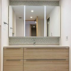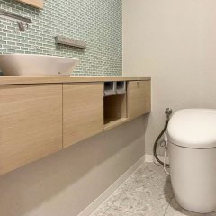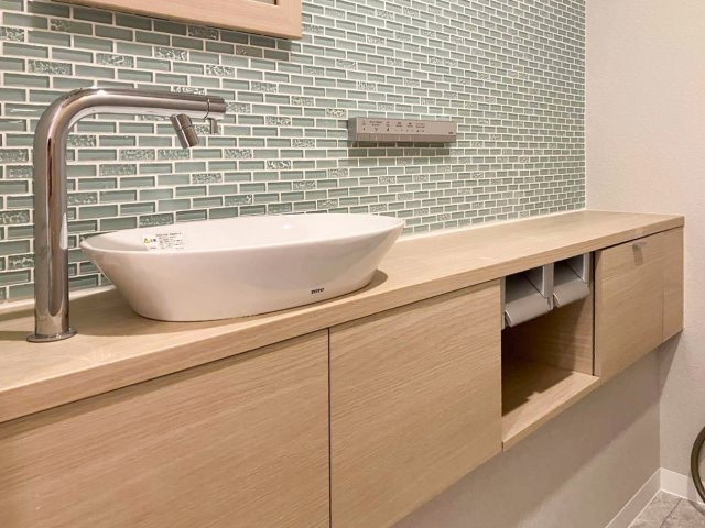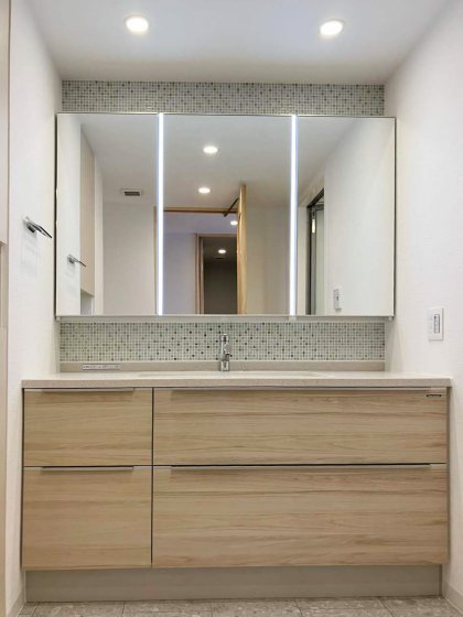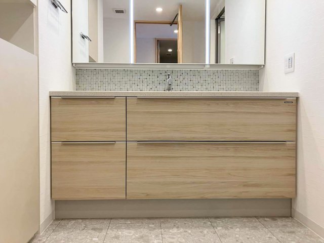 機能面では、高級な手洗い付きキャビネットやモザイクタイルを追加いたしました。