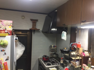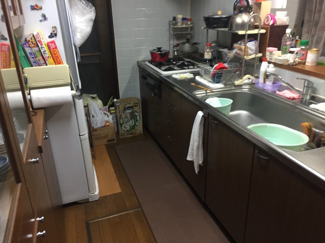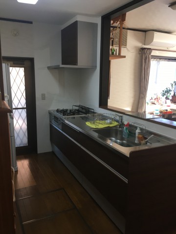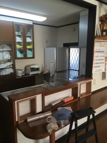 ①既存キッチン解体工事 ②産業廃棄物処理運搬工事 ③キッチンパネル貼り工事(2面) ④システムキッチン組立工事 ※ガス工事は別途 ⑤水道工事 ⑥電気工事 家電収納部分専用回路工事 下がり壁撤去工事 対面カウンター 壁くり抜き造作工事 キッチン室壁ビニールクロス一部貼替工事 天井ビニールクロス貼替工事
