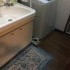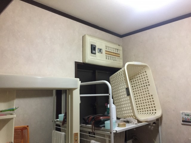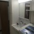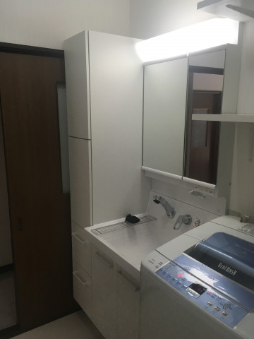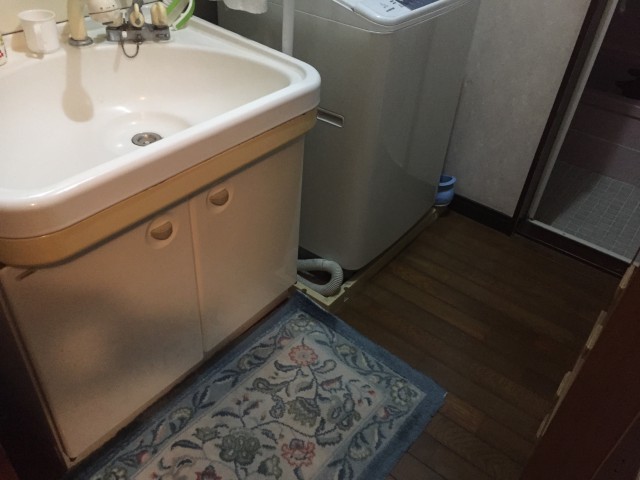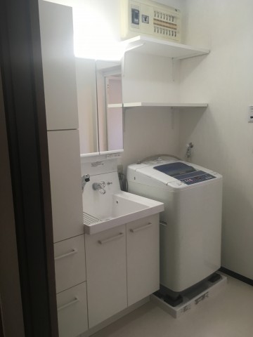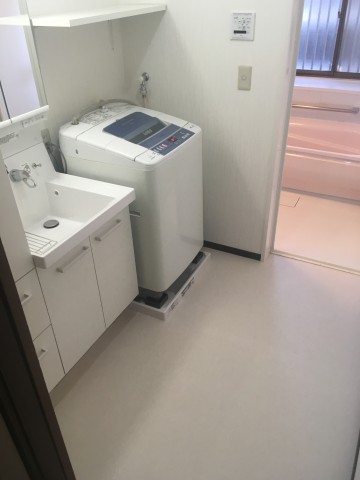 チラシ掲載 洗面内装パック工事 旧洗面窓部塞ぎ 棚造作工事(オープン棚:白ポリ合板) 床下地工事 ※既存の床がフローリングの為、クッションフロアを貼る下地(厚さ12mmベニヤ)を貼りました。