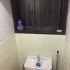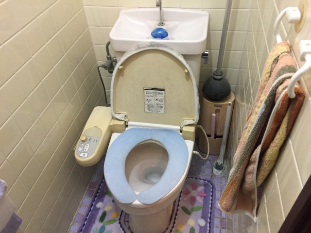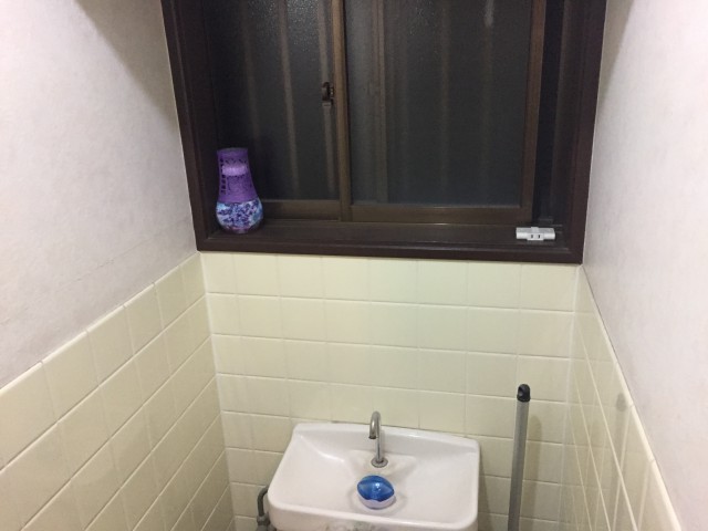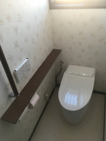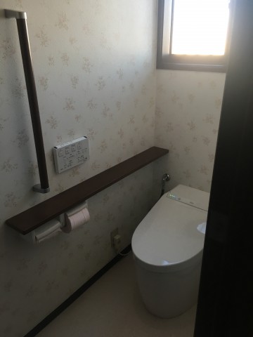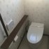 チラシ掲載 トイレ内装パック工事 既存壁タイル撤去工事 手摺付ペーパーホルダー取付工事 床下地工事 ※既存床がタイルの為、クッションフロアが貼れない為、タイルを剥がし、下地(厚さ12mmベニヤ)を貼りました。
