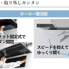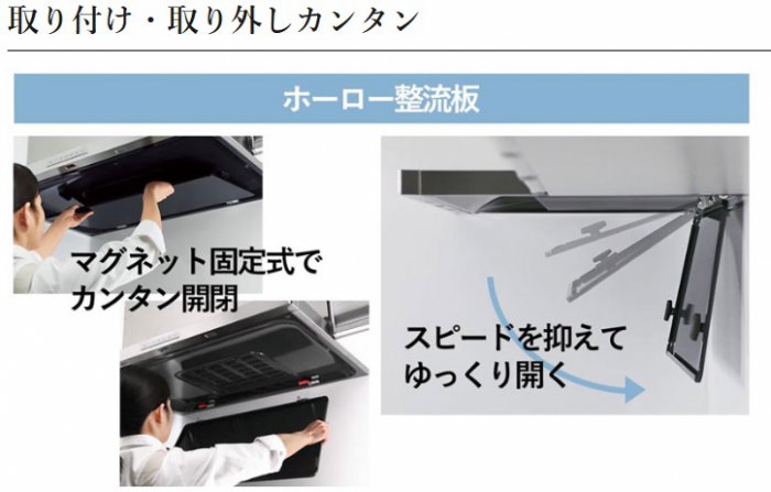 油汚れが最も気になる整流板も、ワンタッチで取り外して丸洗いできるんです。内部のパーツも簡単に着脱できるので、面倒だったレンジフードのお掃除から解放されますよ。