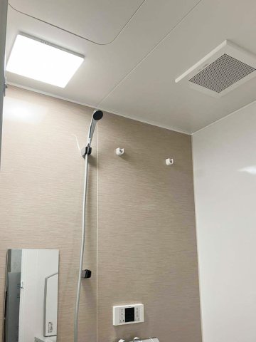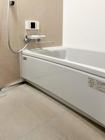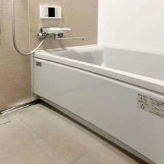 床には「キープクリーンフロア(カームグレー)」を、浴槽は上品なライトグレーのセミスクエア浴槽をセレクト。アクセントパネルには温かみのある「ラミナストーンベージュ」を選び、上質で落ち着いた雰囲気の浴室空間に仕上がりました。