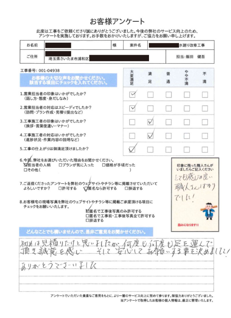 さいたま市・川口市・蕨市・戸田市・越谷市・草加市で戸建てやマンションの水回りリフォーム、内装工事、外壁塗装、住まいのお困りごとはございませんか?嶋澤啓工務店が、お客様のご要望に寄り添い、誠実さと確かな技術で理想の住まいを実現します。お見積もり・ご相談は無料ですので、まずはお気軽にお問い合わせください。