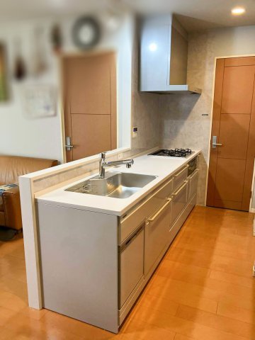 キッチンの扉には上品なライトグレーを、キッチンパネルにはトレンドのコンクリートライト柄をご選択いただきました。