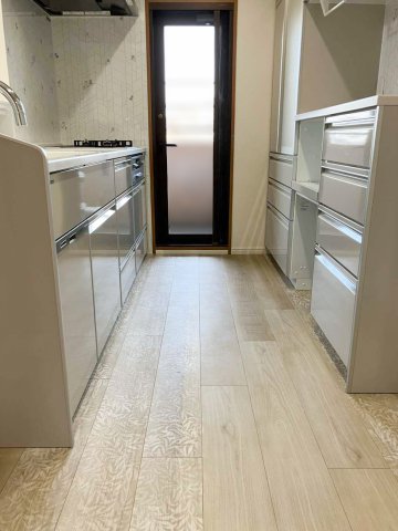 キッチン扉は上品なライトグレー、ワークトップにはソリッドライトグレーのアクリル人造大理石を採用しました。床にはサンゲツのタイル柄フロアを組み合わせ、全体的に落ち着いた色合いの中に、ムーミン柄が引き立つモダンな雰囲気に仕上がっています。