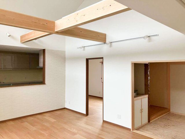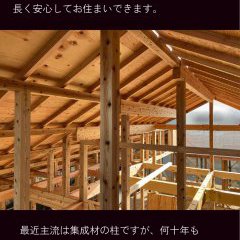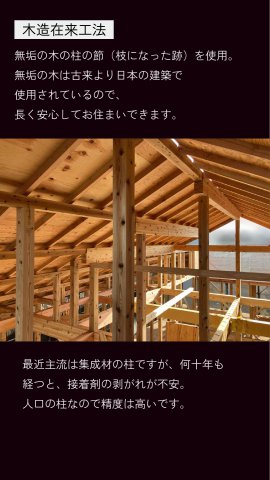 「木造在来工法」を採用し、無垢の木の柱を使用しています。古くから日本の建築で用いられてきた無垢材は、長く安心して暮らせる確かな強度を持っています。集成材とは異なり、接着剤の経年劣化の心配がないため、何十年先もご家族を守る丈夫な家が完成しました。