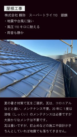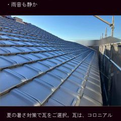 屋根:伝統の風格と気品を感じさせる鶴弥のスーパートライ110タイプ1を使用。どんな家にもマッチするスタンダードな形状で、住まいに格調高さをプラスしています。