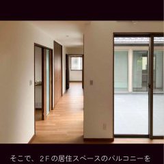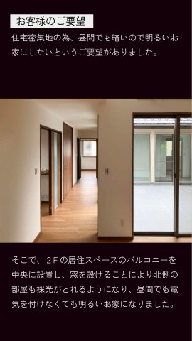 2階の居住スペースの中央にバルコニーを設置し、そこに面して窓を設けることで、北側の部屋にもしっかりと採光を確保。家族が集まるリビングはもちろん、家中どこにいても明るく、開放的な空間を実現しました。