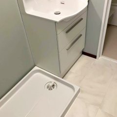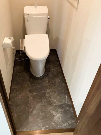 トイレ: LIXILのアメージュ便器を採用しました。少ない水でもしっかり汚れを流す「パワーストリーム洗浄」や、お手入れがしやすい「フチレス形状」が特徴です。リフォームに最適なリトイレタイプなので、既存の配管を活かして設置できます。