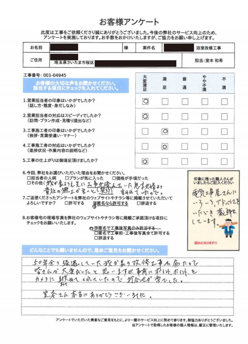 お世話になっております。この度の工事では大変お世話になり誠にありがとうございました。その後、新しいお風呂はいかがでしょうか。これから寒い季節がやって来ますが、これからは暖かいお風呂に入れます。これからもお住まいのこと、ご相談頂ければ幸いです。今後ともどうぞ宜しくお願い申し上げます。