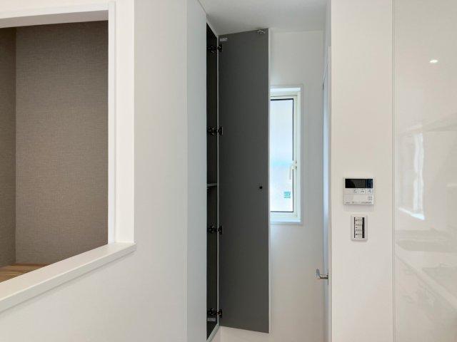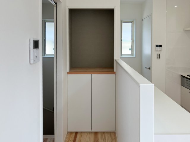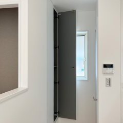 デザイン性を高めるため、クローゼットの取手は付けずにスッキリと仕上げました。キッチン前には、玄関用の収納コンポリオを転用し、プッシュラッチ式で目立たずに収納力を確保。無垢の床を映えさせるように、各部位はホワイトに統一しました。細部にまでこだわった、使いやすい家が完成しました。