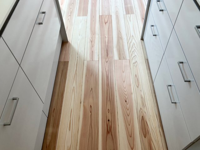 リビングや水まわりまで、あえてクッションフロア(CF)を使わず無垢の床材を採用しました。