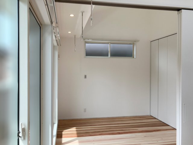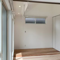 デザイン: 無垢の床材を主役にするため、内装の他は白一色で統一。木のぬくもりが際立つ、シンプルで美しい空間が完成しました。