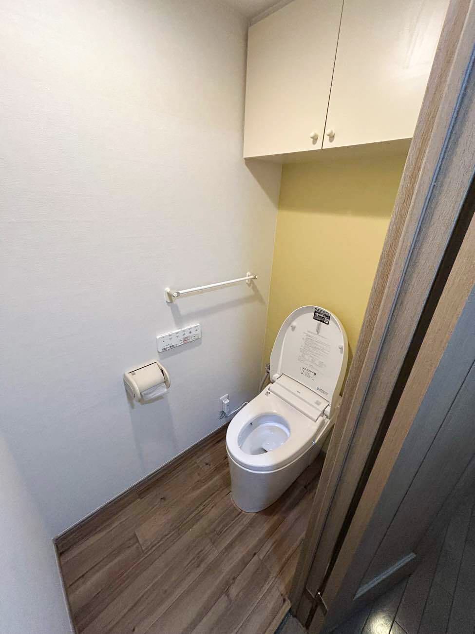 アクセントクロス: イエローのアクセントクロスを採用し、トイレ空間全体を明るく、開放的な雰囲気に演出。
