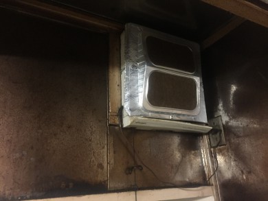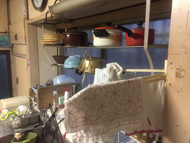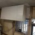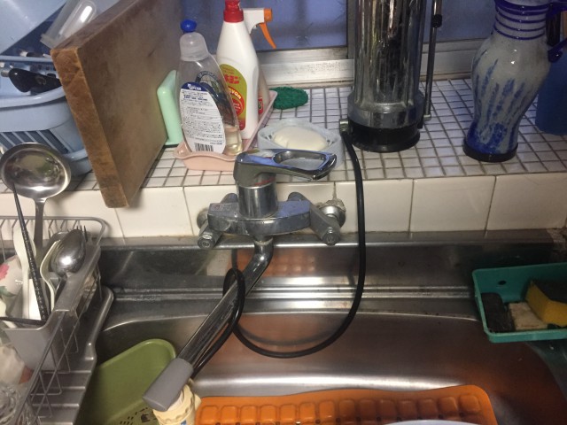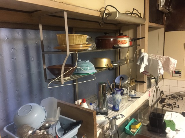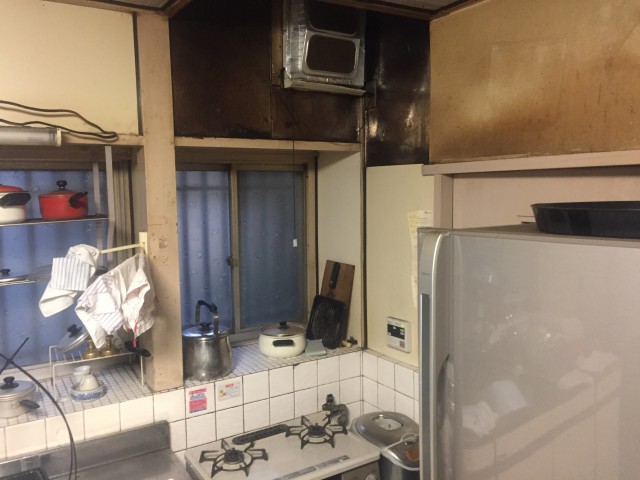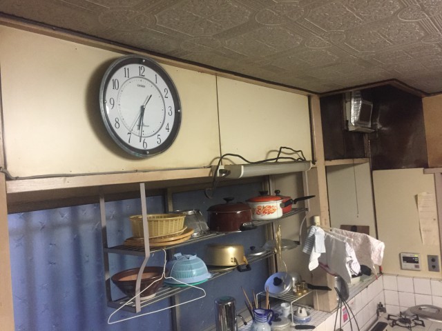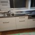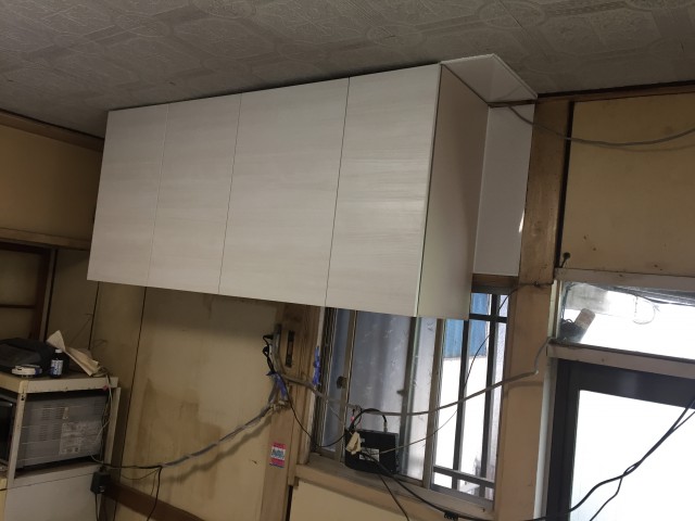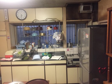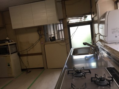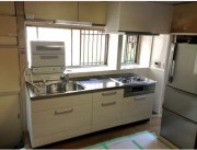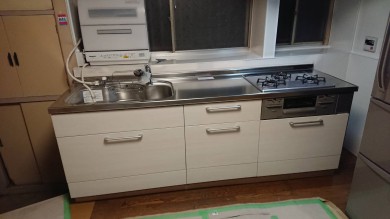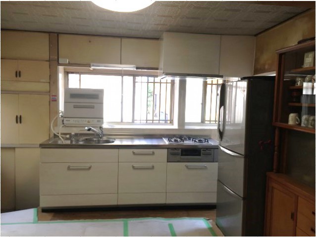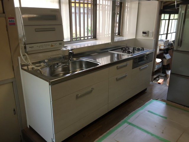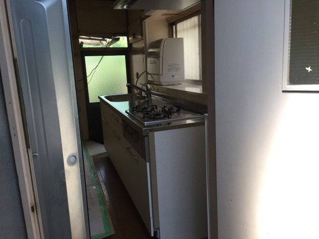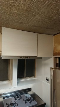 今回のキッチン工事での主に工夫した箇所については、下屋ヘ行くドアの動線を確保する為に、レンジフ-ドとキッチン全体を30cm程左側に寄せて設置した点と正面の窓が暗くならない様に、吊戸棚をキッチンの左壁ヘ単独で設置した点でした。