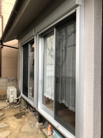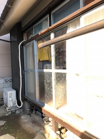 ③サッシ:LIXIL デュオPG シャッター付引違い窓 イタリヤ 手動。雨戸一筋の腐食・サッシ廻りの寒さが気になるとのことでしたのでご提案させて頂きました。名前に『PG』と入っているぐらいですから、もちろん2枚硝子です。同時に既存の雨戸1枚が重く、使いづらそうでしたので上げ下げがしやすいシャッターに致しました。