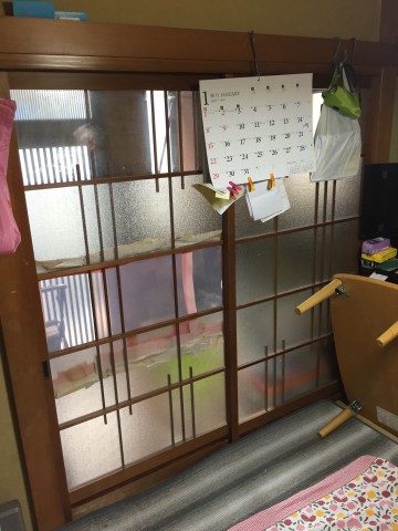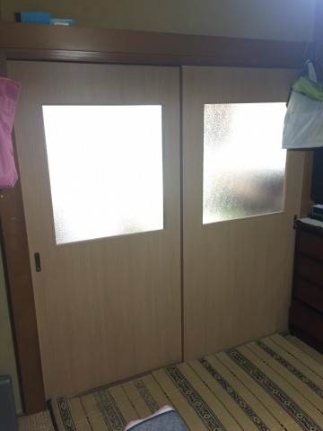 ②引違い戸:過去に扉にぶつかってガラスが割れてしまったということがあったそうです。もともと玄関側からの光が凄く入っていたということもあり、半分ガラスの採光タイプを採用しました。