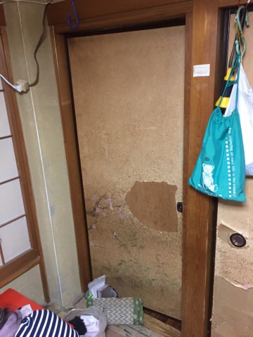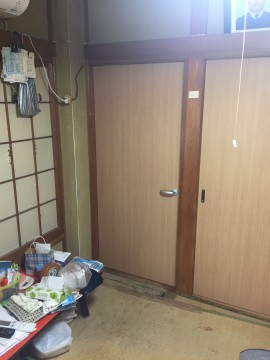 ①片開き戸:襖紙がボロボロで張り替えではなく交換する必要がありました。今後張り替えの手間を省く為に阿部興業のフラッシュ戸を採用。使い勝手も考え、レバーハンドルにしました。