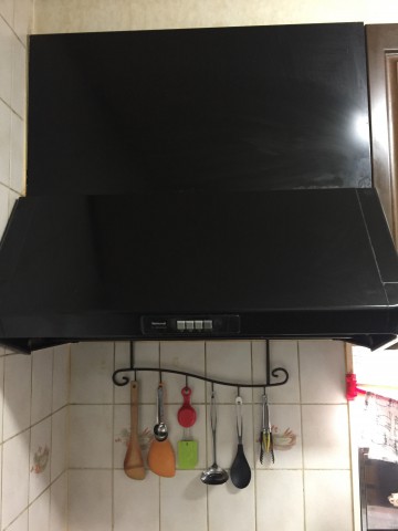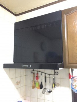 ①レンジフード:既存のサイズが幅900mm.高さ850mmでした。お客様ご希望のLIXILのADRシリーズは高さ850mmはありませんでした。(700mmまでしかない)余りの150mmは同色である黒のフィラーで納め、見た目すっきりしました。
