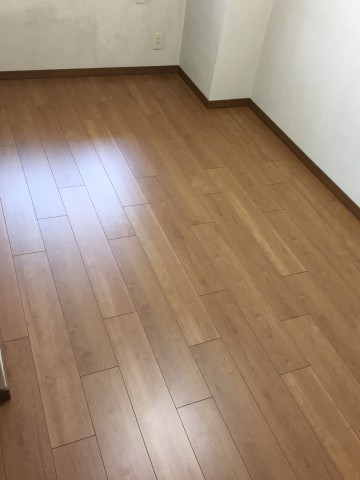 マンションでしたので、L-45のフローリングで一番お求めやすいジャパン建材のブルズをご提案。色は明るすぎず暗すぎないチェリー柄にしました。幅木に関しては既存がソフト幅木でしたので、新しくパナソニックのベリティスの木幅木に交換。色はアクセントとしてフローリングより濃いウォールナット柄にしました。