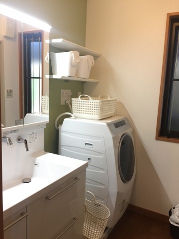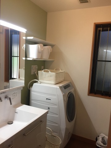 緑のアクセントクロスで白が映えるさわやかな洗面所になりました。