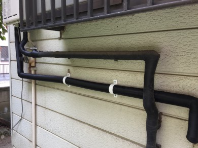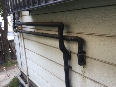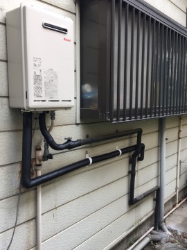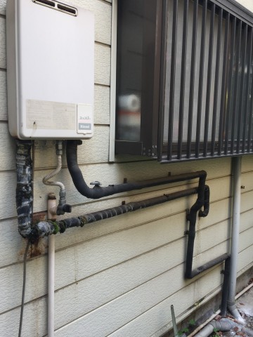 ①給湯器:15年ほどお使いの給湯器。今回給湯専用機の交換と給湯管のやり替えを行ないました。既存が銅管だったので新規で架橋ポリエチレン管にやり替えました。給湯管に関しては接合部からの漏れが生じていました。工事の際にしっかり原因が分かり、大変よかったと思います。