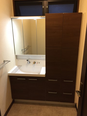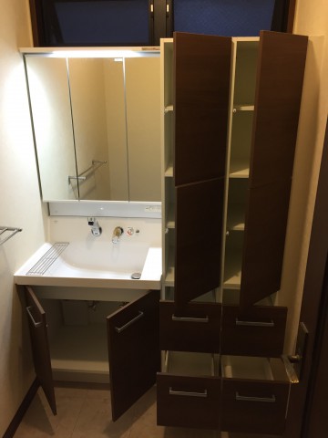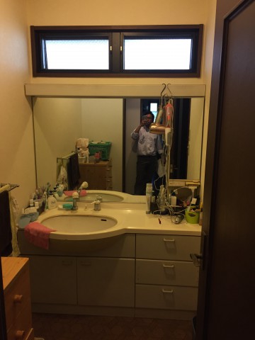 既存はカウンタータイプの洗面化粧台に一面鏡の組合せで、衣類等の収納には洋タンスを