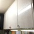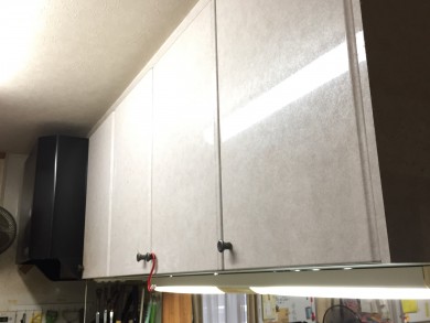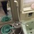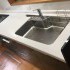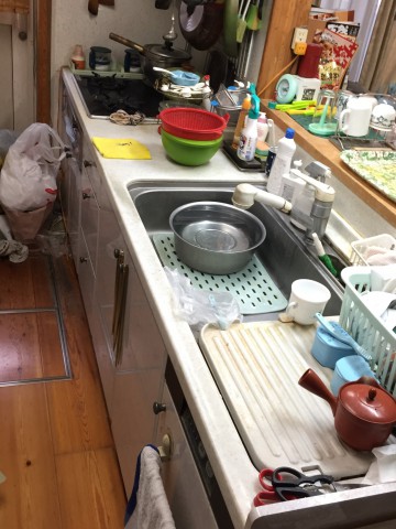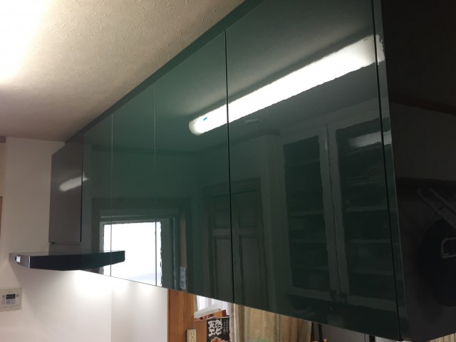 ①キッチン:ほうき水栓・すべり台シンク・スーパークリーンフードのTOTOのミッテを採用。施主様はもともと緑色が好きで、シーンダークグリーンをご提案したところ、凄く気に入ってくださいました。また、今までは食器洗い乾燥機がありましたが、今回は必要ないということでしたので、もともとの食器洗い乾燥機用コンセントを天板の上に移設しました。