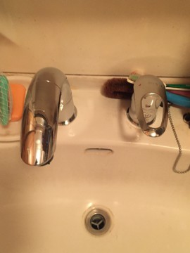 ④洗面水栓:TOTOのニューウエーブシリーズ台付シングル混合水栓を採用。
