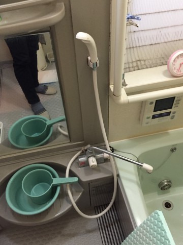 ③浴室水栓:TOTOのGGシリーズ台付サーモスタット水栓エアインめっきを採用。