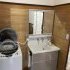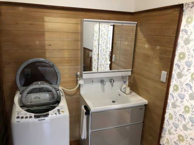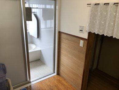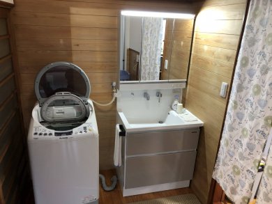 その際、壁と床に使われていた無垢材はアク洗いできれいに磨きそのまま活かし、汚れていた珪藻土の壁だけを新しく壁紙を貼ることで、明るくきれいな洗面脱衣所になりました。