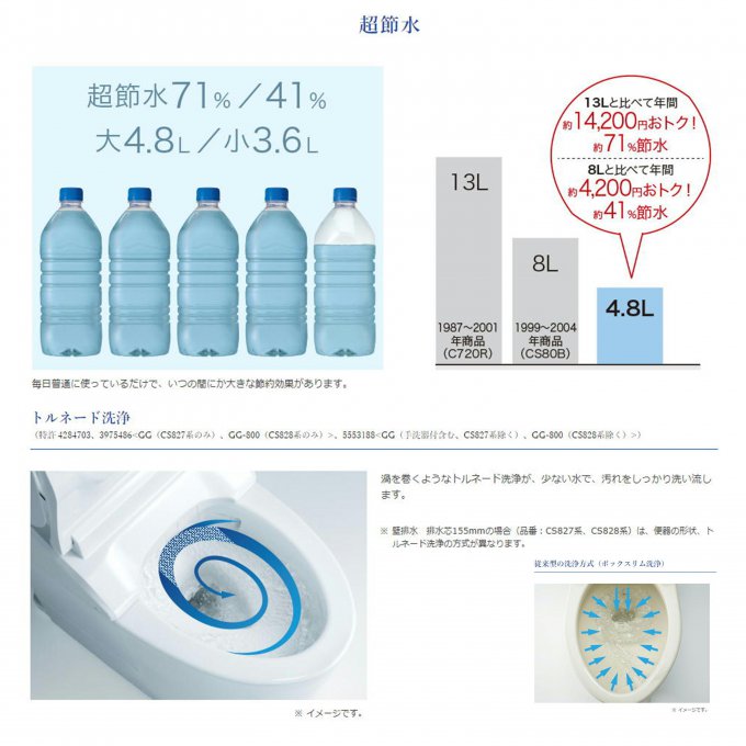 従来のトイレと比べて最大約71%も節水となっております。