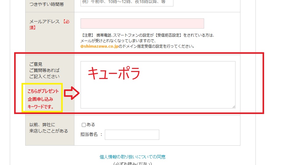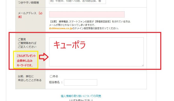以下URLの来店予約申し込みフォームの下部にございますご意見欄に