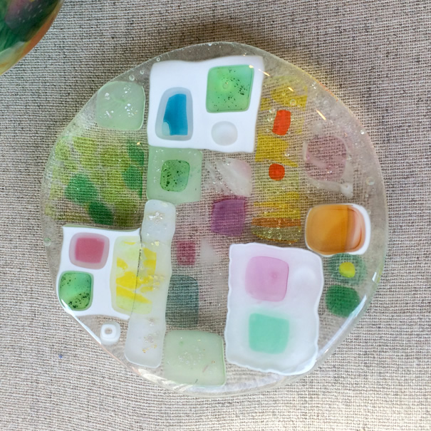 色ガラス(ガラス板・ガラス棒・ガラスビーズ)を重ねたり組み合わせたものを、電気炉に入れて焼き溶かす「フュージング技法」で作る豆皿です。