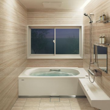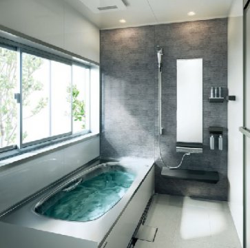 主な仕様:キレイサーモフロア・サーモバスS・人造大理石浴槽・まる洗いカウンター・2枚組風風呂フタ・換気暖房乾燥機・フルフォールスライドバー・うるつや浄水・スイッチ付エコアクアシャワー