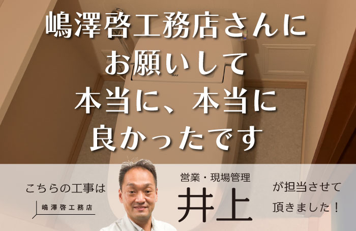 自宅が築15年になり、トイレのリフォームを考えてまずはLIXILのショールームへ行き、最初はLIXILの関連会社を紹介され見積を依頼しましたが、1週間の約束が10日経って来てなおかつ施工が3ヵ月後とのことで、一度は諦めましたが自分で嶋澤啓工務店さんを探し、ネットでの評判がとても良いので、お電話をさせていただきました。電話に出て下さった方も対応が良く、担当の井上さんもとても迅速、丁寧な対応で見積依頼からわずか3週間で施工していただけました。施工後クロスの色が一部違う所があり、お聞きしたところすぐに来ていただいて確認していただくと、ただ単に換気扇の影とわかり、大変ご迷惑をおかけしてすみませんでした。